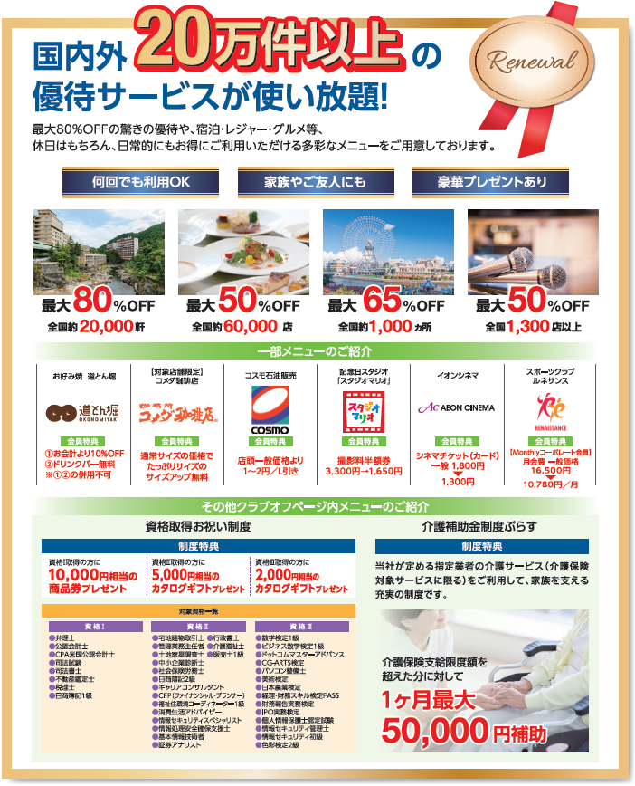 日本全国、20万件以上の優待サービスが、追加費用なくご利用いただけます。飲食店やガソリンスタンド、映画館、スポーツジムなど幅広いの優待がご利用いただけます。